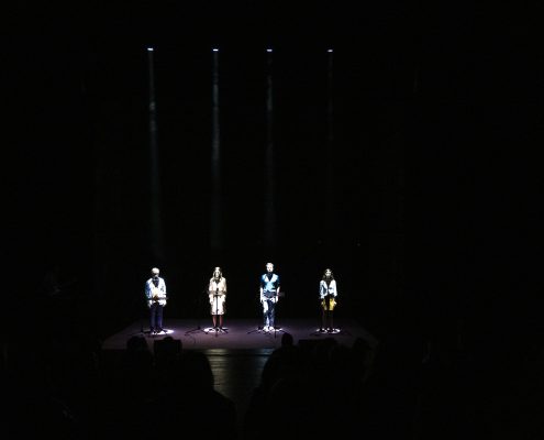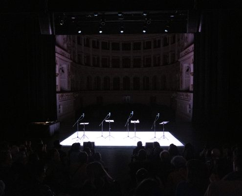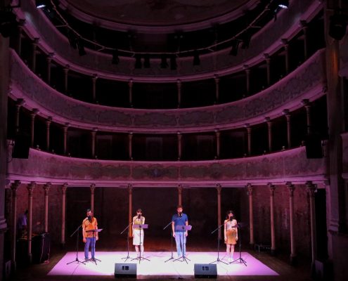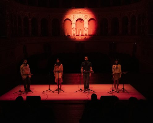 Si può viaggiare nel tempo attraverso il suono? Si può costruire un racconto sonoro che prenda forma soltanto nella mente degli/delle spettatori/spettatrici? Ashes è un aleph di suoni che scorrono paralleli, un flusso di attimi che si sovrappongono, si fanno sentire per un istante prima di scomparire. Un concerto per voci e musica eseguita dal vivo, un viaggio sonoro immersivo: una riflessione sul potere immaginifico del suono e della parola, sull’importanza dell’“ora” e sulle sue caratteristiche di impermanenza, così affascinanti e disturbanti allo stesso tempo. Una sequenza di accadimenti si svolge senza soluzione di continuità: brevi frammenti di vite private, compleanni, feste, morti, cadute, uccisioni, animali, alberi di Natale, dinosauri, microbiologia, geologia, tutto quello che passa e non resta, ma che definisce e conferisce un significato preciso alla vita di noi esseri umani. I quattro performer parlano, giocano, urlano, lottano, confessano segreti e fanno dichiarazioni d’amore. Voci che generano dinosauri e lupi, funghi e balenottere, madri, padri, figli e figlie, che solo per un attimo si trovano in quel tempo e in quello spazio, pronti a scomparire con l’evanescenza del fiato che si dissolve. È solo la voce che avvera la presenza, crea mondi, tesse relazioni, genera visioni. Marco Cavalcoli, Monica Piseddu, Federica Dordei, Giovanni Onorato parlano, giocano, urlano, lottano, confessano segreti, fanno dichiarazioni d’amore, in uno spazio che non cambia mai, in un singolo punto sulla terra, come ce ne sono milioni di altri, speciale e anonimo allo stesso tempo.