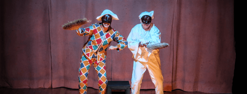 Si tratta di un enigma da risolvere per Arlecchino e Pulcinella. Chi è il cavaliere misterioso? Per risolverla i due servi dovranno affrontare insieme il mare e una tempesta tropicale, le tempeste emotive dell’amore, gli inganni del Signor Pantalone dei Bisognosi, la vanità del Dottore. Ma nella bella Venezia l’amore ancora vince sull’avidità e i giochi di potere. Dopo un intreccio di bugie , furberie… astuzie e trabocchetti: colpo di scena! Il traditore verrà arrestato e il cavaliere misterioso smascherato. Ispirandosi ai canovacci della Commedia dell’Arte, Claudio De Maglio scrive una storia antica e attuale. Sei personaggi della Commedia Dell’Arte rappresentati da due attori.