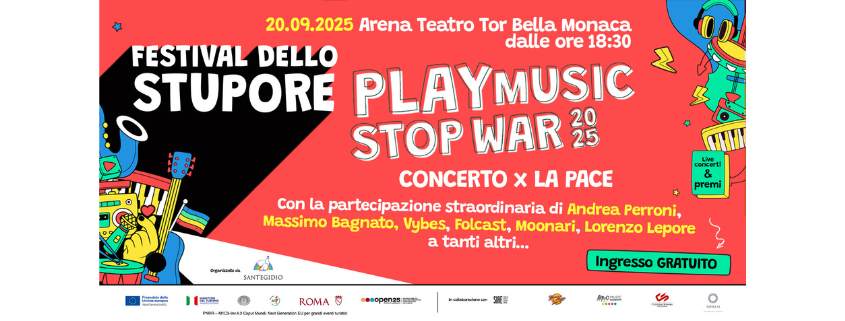 Roma, 11 Settembre 2025- Torna anche quest’anno l’atteso appuntamento con il Concerto per la Pace “Play Music Stop War”, ospitato all’interno della cornice del “Festival dello Stupore”. L’evento, a ingresso libero, si terrà il 20 settembre all’Arena del Teatro di Tor Bella Monaca e sarà condotto dal noto comico e presentatore Andrea Perroni.