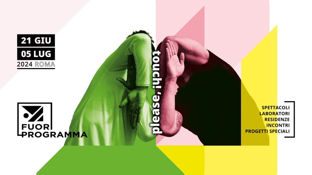 Fuori Programma giunge alla sua nona edizione dal titolo Please, touch! un invito a “toccare” le risonanze espressive e culturali chiamate in causa dalle diverse autorialità in programma, provenienti da quattro continenti: Bassam Abou Diab (LB), Mk (IT), Leonardo Delogu e Valerio Sirna/DOM- (IT), Brigel Gjoka & Rauf “Rubberlegz” Yasit (AL/USA/UK), Asier Zabaleta/ERTZA (MOZ), Salvo Lombardo (IT), Cie Linga (CH), Compagnie Zimarèl (GLP), Adriana Boriello (IT), Aristide Rontini (IT), Off Projects (NL), Frantics Dance Company (DE), Graham Feeny (USA), Flavia Zaganelli (IT), Chey Jurado & Javito Mario (ES).
