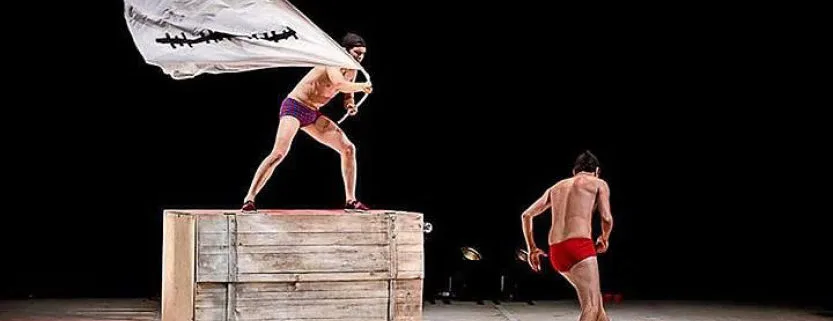Hallo! I’m jacket! è uno spettacolo fortemente ironico. E’ il riflesso ridicolo e dissacrante di un sentire che trae invece origine da riflessioni ben più amare, che riguardano in generale il cosiddetto “mondo contemporaneo”, con la sua rapidità da fast food mediatico, cultura usa e getta e ansia performativa. Immersi fino al collo in una realtà che sembra dare sempre più credito a ciò che semplicemente è di tendenza, ci “facciamo beffa” di questo nostro essere costantemente assillati dall’idea di essere: Produttivi! Seduttivi! Interessanti! Alternativi! Fighi! Indipendentemente da quali siano i contenuti e i saperi. L’amarezza lascia però spazio totale alla buffoneria, alla presa in giro, all’ironia surreale. In questo mondo così caricaturizzato, qual è il rapporto dell’artista con la creazione? Con lo stare in scena? Con l’esibire se stesso su un palco vuoto? Cos’ha da dire questo teatro contemporaneo? In Hallo! I’m jacket! tutto viene estremizzato: la performance artistica è metaforicamente tradotta con la prestazione sportiva. Il performer, un atleta che, sul palco, sventola con convinzione la bandiera bianca della mancanza totale di contenuti. Sul volto, lo smagliante sorriso dell’idiozia. Il teatro, è paradossalmente trasformato nello stadio che accoglie all’attesissimo “campionato mondiale della performance”. I due performer, i due buffoni, i due clown di questo spettacolo lottano, gareggiano, danzano, sudano… per nulla! solo per piacervi, per farvi divertire.