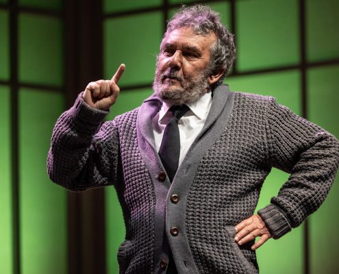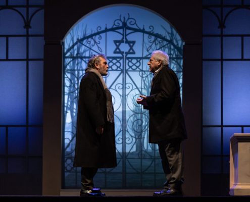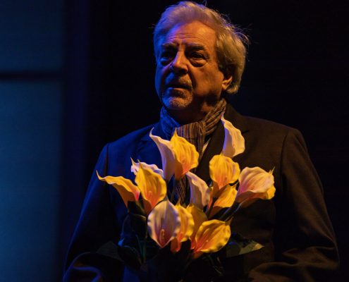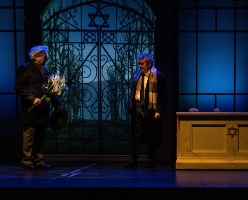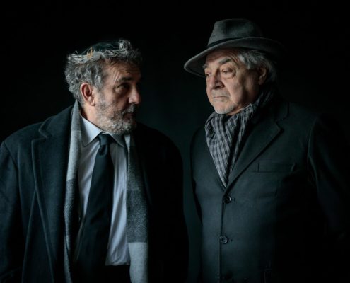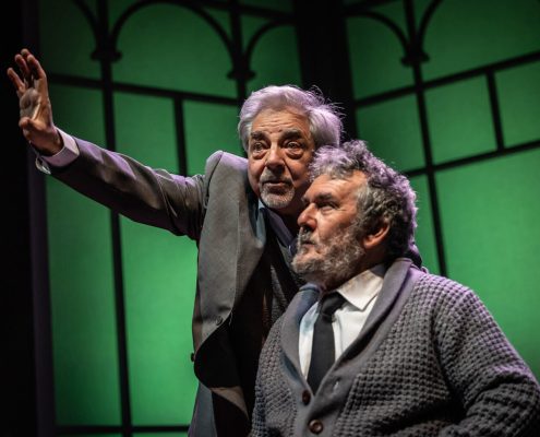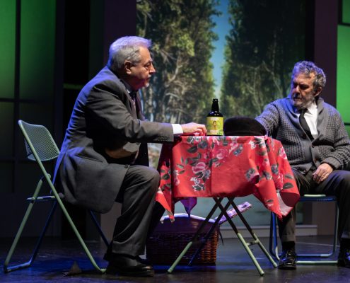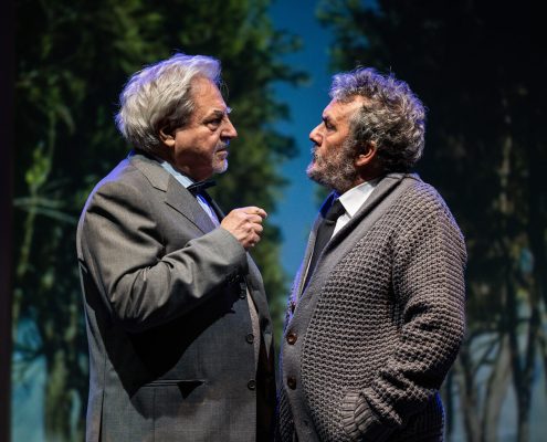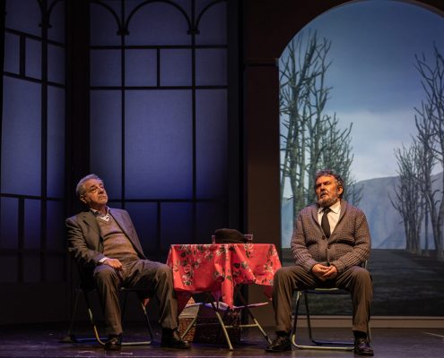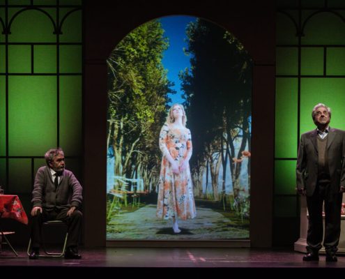 Ci siamo mai chiesti se i nostri partner hanno giardini segreti da cui noi siamo esclusi? E noi, se li abbiamo, perché sentiamo l’esigenza di farlo? In altre parole, il tradimento avviene solo in presenza di una relazione fisica, o lo è altrettanto quando il rapporto sentimentale è platonico? Questo testo, scritto quarant’anni fa, mantiene la sua vivacità in questa esplorazione dell’identità, sfidando le nostre convinzioni sulle relazioni e analizzando l’idea di infedeltà emotiva proprio nell’epoca dei social media, laddove molte liaisons sbocciano e vengono coltivate in maniera dangereuse all’insaputa del partner. Quello che i due uomini scoprono man mano è che nessuno dei due conosceva davvero la donna amata: è come se la Flo di Edoardo e la Maria Flora di David fossero due persone diverse. La sensazione è che ognuno dei due, a suo modo e inconsapevolmente, l’abbia accompagnata nel disvelamento di sé, sulle tracce nascoste, ma in lei già presenti, di quel carattere che entrambi amavano. La sfida richiesta agli attori è quella di darle vita, facendo intravedere le loro reciproche qualità, che l’hanno attratta da giovane, e poi tenuto vivo il suo sentimento negli anni a seguire. Il suo essere arlésienne – come usano i francesi definire un personaggio al centro della trama, ma che non compare mai in scena – è in questo allestimento mitigato da ambivalenti apparizioni filmate lungo un sentiero rettilineo, che attraversa le stagioni e conduce verso l’infinito (l’aldilà?). All’interno del parco è inedita anche la presenza della serra, qui suggerita sia da Flo/Maria Flora (Florence in originale), più volte descritta, nomen omen, come amante dei fiori, sia da quel “Now I find I’ve been in a glass cage”, pronunciato dal marito sconvolto dalla scoperta del segreto legame, e da noi rafforzato anche con la bizzarra indicazione del bambino. Intangibile, seppur qui innevata, è invece la cornice del cimitero, che apre e chiude la storia. Vi si conclude (ma si conclude davvero?) la polemica amorosa tra due uomini che virano verso la vecchiaia, affrontata però con piglio giovanile. Quasi infantile è poi il gesto dell’iscrizione funebre, in cui la formale accettazione dell’altro non riesce a cancellare l’antagonismo tipico degli amici sinceri. Cosa resta dell’amore dopo la morte? Il duello offre continui ribaltamenti di ruolo: una volta firmata la tregua emotiva, impossibile determinare chi sia stato veramente fedele alla donna, e chi l’amava di più. Ma questo dà alla commedia il suo fascino, la sua freschezza e forse tutto il senso. Perché, se è vano litigare, soprattutto a posteriori, per determinare chi è stato veramente amato, non lo è testimoniare in questo modo il potere rigenerativo dell’amore, e la sua capacità di accendere, oltre la morte.