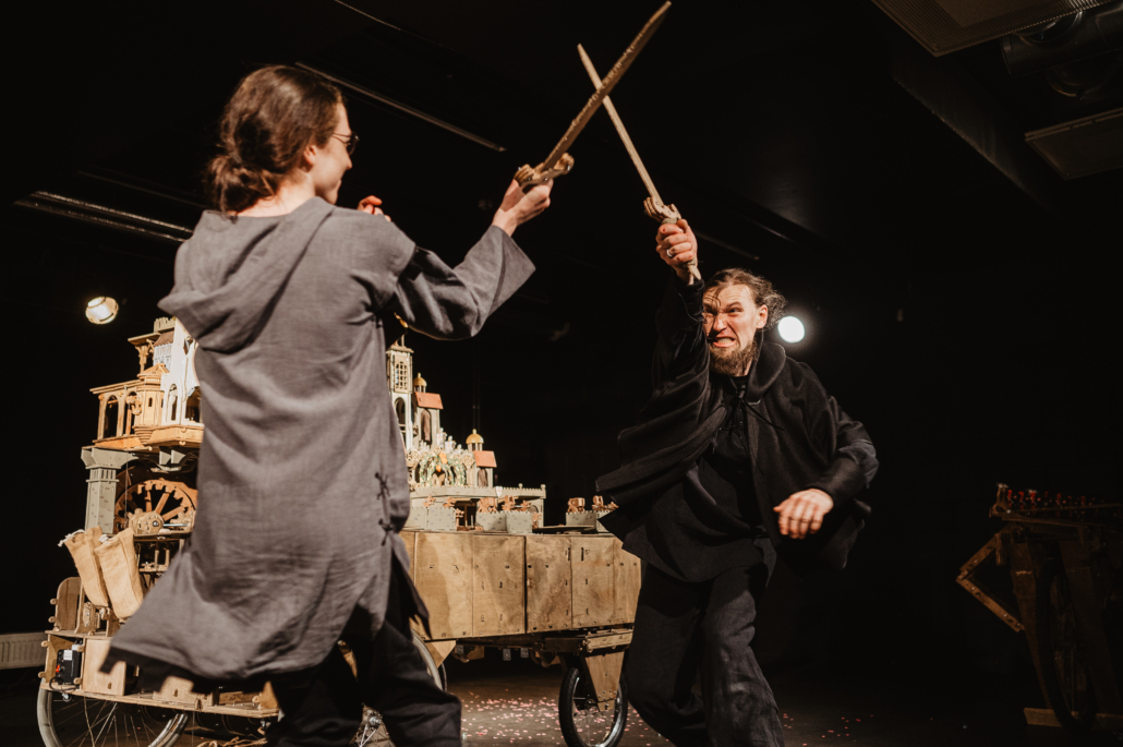 Durante lo spettacolo il pubblico assiste all’entrata in azione di macchine d’assedio e catapulte, alle astuzie dei difensori e ai tradimenti che si consumano tra le mura. Il finale sorprende e ribalta ogni previsione. Il castello è un vero scrigno di meraviglie: pareti scorrevoli, elementi mobili, stanze segrete e misteriosi abitanti animano la scena. L’atmosfera gotico-medievale è intensa e avvolgente; mistero e magia sono amplificati da una colonna sonora incalzante, carica di tensione. Kuthi è uno spettacolo di teatro di figura senza parole che intreccia arte, ingegneria e meccanica. Lo spettatore è immerso in un castello medievale vivo e pulsante, attraversato da colpi di scena improvvisi. La struttura scenica prende vita grazie a sofisticati meccanismi in legno: muri che scorrono, parti che si trasformano, ambienti nascosti che si rivelano all’improvviso. Tutti gli elementi scenografici e i personaggi sono realizzati artigianalmente in legno, contribuendo a creare un universo visivo fortemente caratterizzato. Lo spettacolo è stato presentato in numerosi festival internazionali e ha ricevuto diversi premi, in particolare per la qualità e l’originalità della scenografia.
