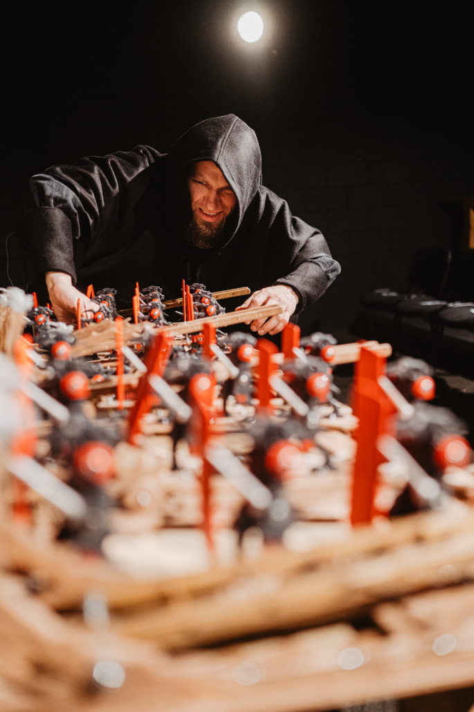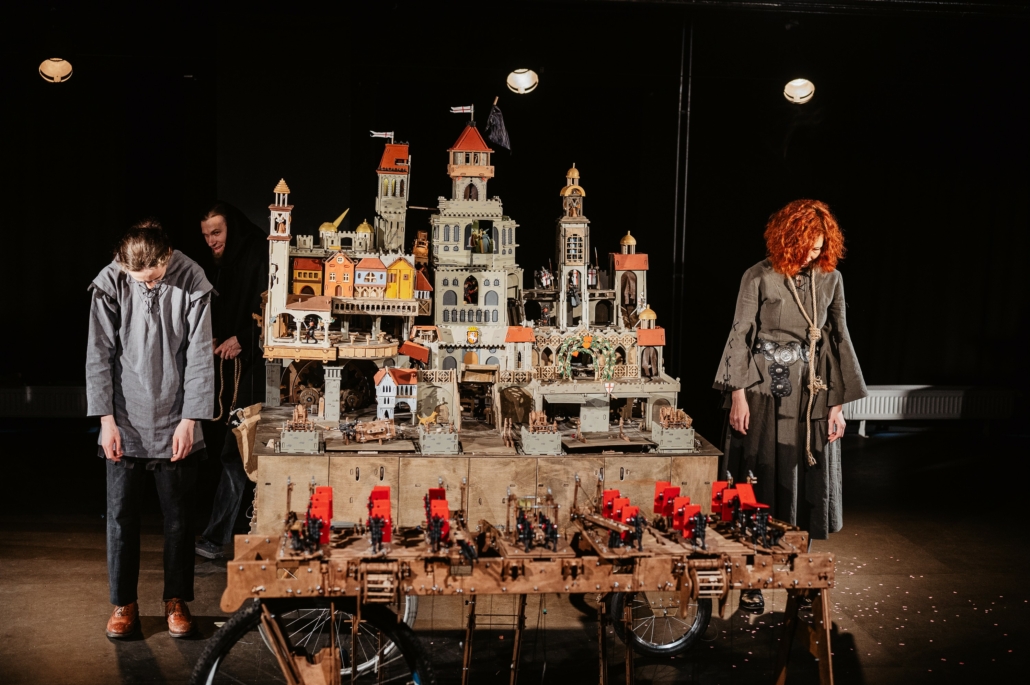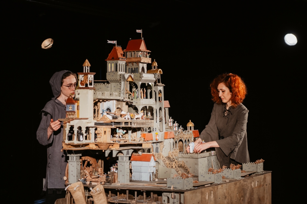 Nel giorno delle nozze della principessa, il castello si anima e viene assediato dai misteriosi guerrieri-corvo Kuthi: tra catapulte, astuzie e tradimenti, nulla andrà come previsto. Un teatro meccanico in legno, dove ingranaggi, pareti scorrevoli e stanze segrete costruiscono un mondo medievale vivo, sorprendente e carico di tensione.