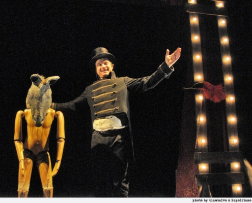 Flavio Albanese racconta in prima persona la vera storia di Pinocchio sulle note della celebre musica che Fiorenzo Carpi scrisse per il film-TV di Comencini. Tra prosa e filastrocche, racconti, canzoni, arie e recitativi, lo spettacolo ripercorre le principali vicende che hanno portato un semplice “ciocco” di legno a diventare un bambino. I personaggi appaiono e scompaiono sulla scena, a volte impersonati dallo stesso attore, altre volte evocati attraverso la magia e gli espedienti del teatro di Varietà. Ci sono proprio tutti: Geppetto, la Fatina, il Gatto e la Volpe, il Grillo parlante, Mangiafuoco, l’Omino di burro, il Domatore e il Pappagallo. È una storia per grandi e piccini e in particolare per “burattini che vogliono diventare bambini”.